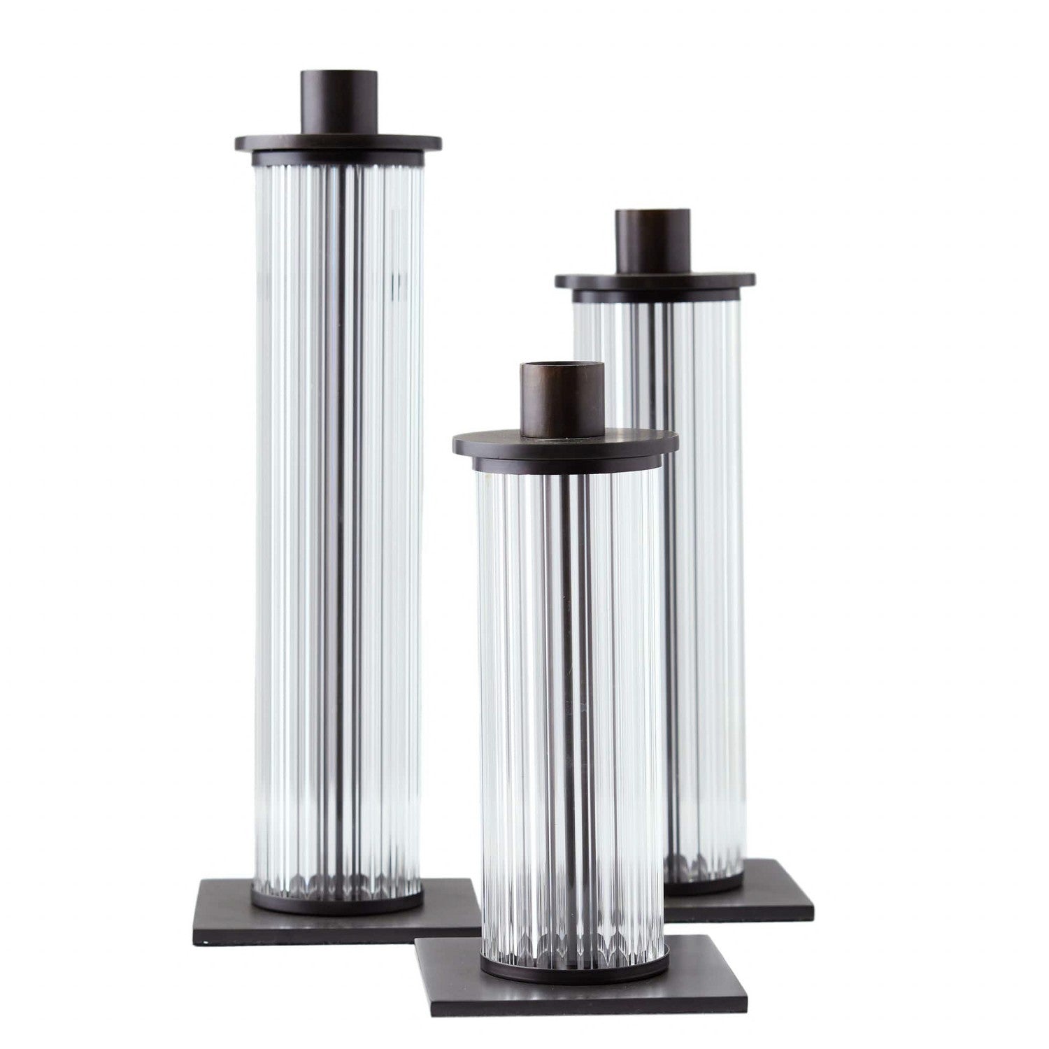 Our Wimble Candleholders Offer A Stylistic Nod To The Fluting Detail Often Seen In Architectural Columns. The Reflective, Clear Glass Taper Holders Are Accented With Bronze-Finished Steel Bases And Candle Cups. On Any Surface, The Trio Creates An Elegant And Timeless Display. Candleholders, Set of 3
